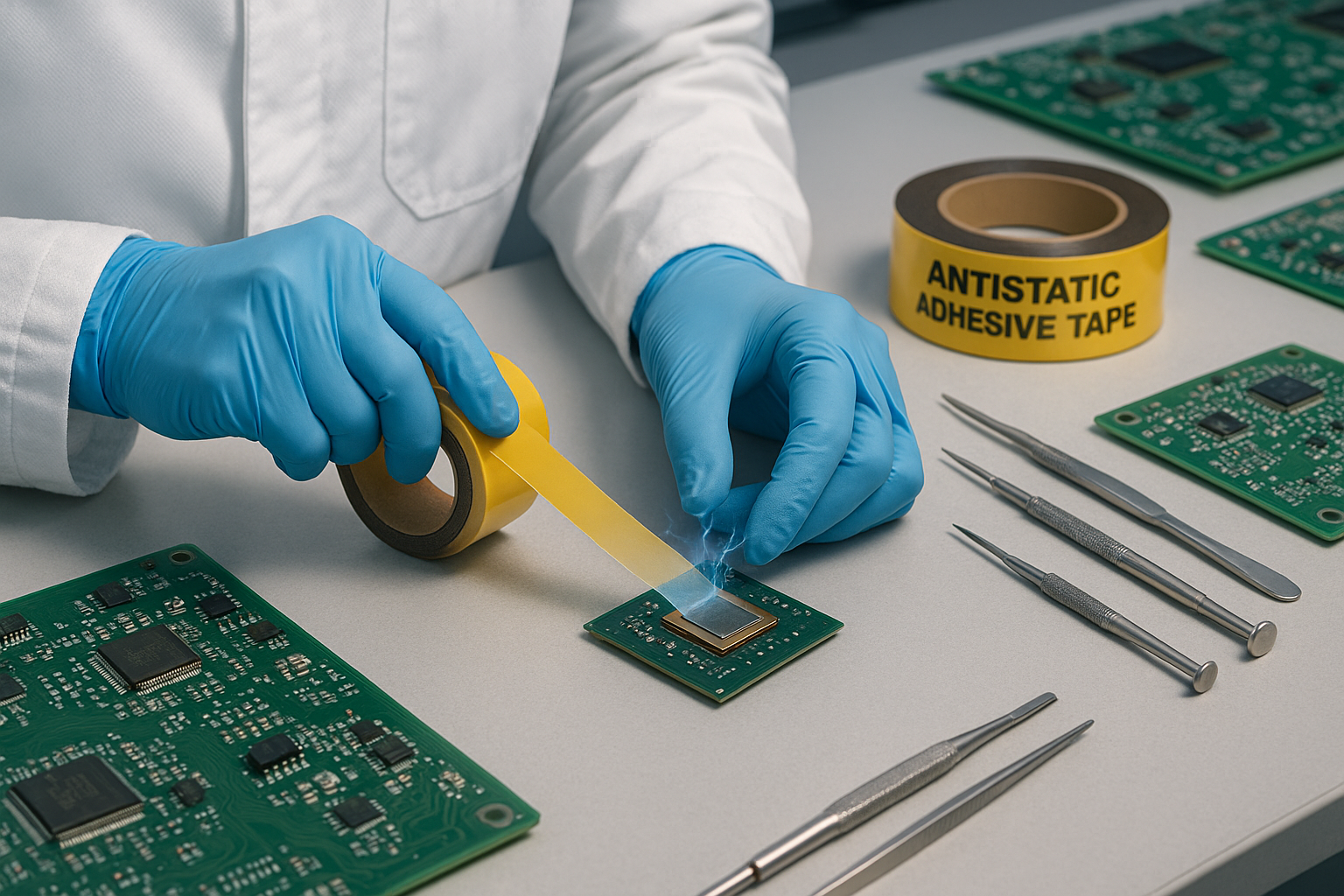 Pemasangan papan litar bercetak (PCB) dan pengendalian komponen semikonduktor adalah antara kes penggunaan keutamaan tertinggi untuk pita antistatik. Dalam operasi pilih dan tempat, pengumpan pita dan pita pembawa yang terkumpul caj boleh salah suap atau menarik bahan cemar; dalam persekitaran aliran semula dan pateri gelombang, zarah bercas boleh menyebabkan kecacatan pateri. Menggunakan pita dengan kerintangan permukaan terkawal membantu mengekalkan tetingkap proses selamat ESD dan meminimumkan kegagalan pemasangan yang disebabkan oleh peristiwa elektrostatik.
