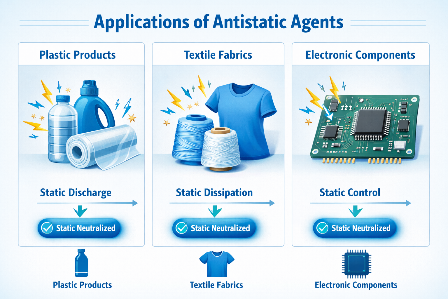 Dalam aplikasi plastik, pembentukan cas statik adalah perkara biasa disebabkan oleh kekonduksian permukaan yang rendah. Ejen antistatik boleh digabungkan sebagai salutan permukaan atau bahan tambahan dalaman semasa proses penyemperitan, pengacuan atau pengeluaran filem. Pilihan antara ejen antistatik kekal atau sementara bergantung pada jangka hayat produk dan pendedahan alam sekitar.